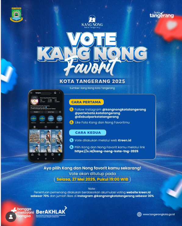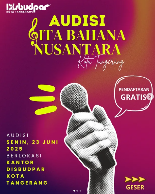07 Jul 2023 18:00 GRAND FINAL PEMILIHAN KANG NONG KOTA TANGERANG 2023 Read More 16 May 2023 14:01 Lomba Vlog HUT RI ke-77 Read More 03 May 2023 12:45 Audisi Gita Bahana Nusantara 2023 Kota Tangerang