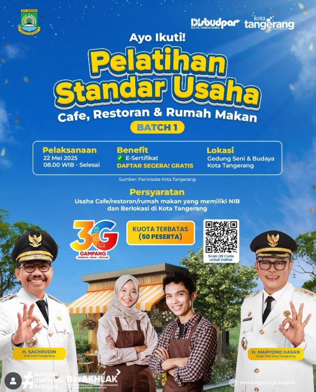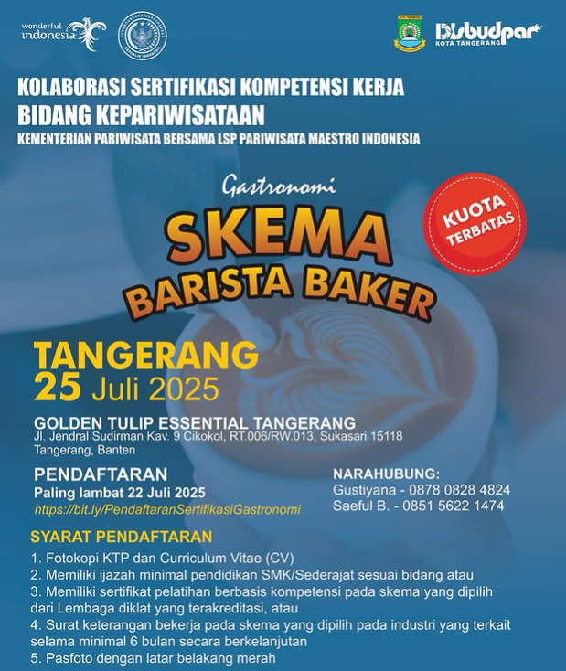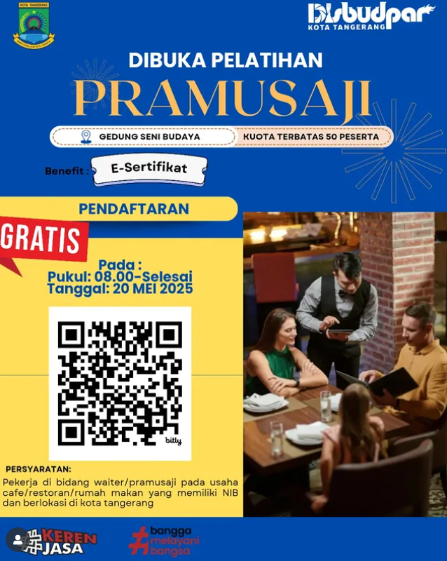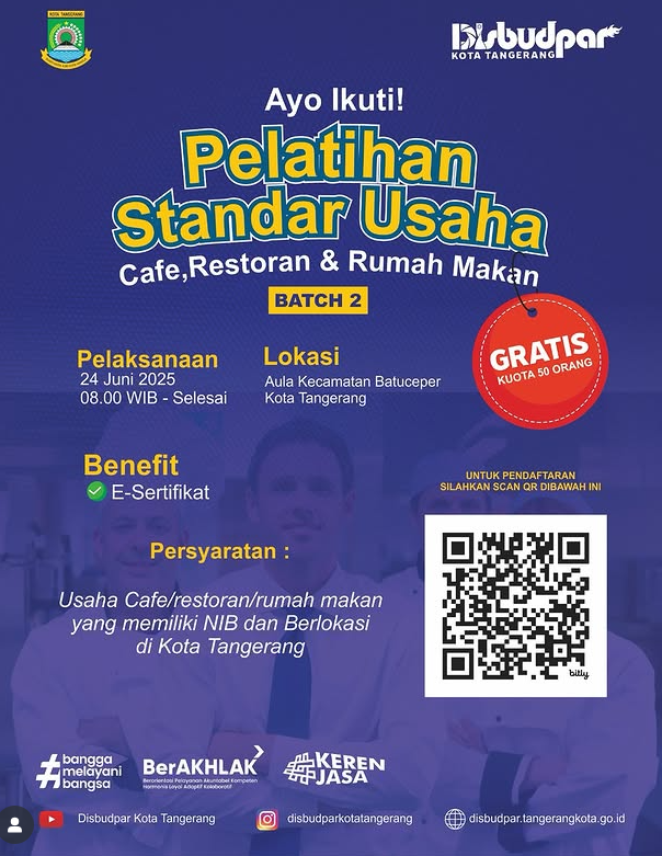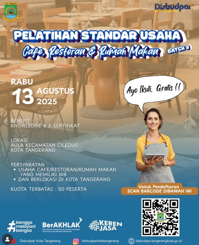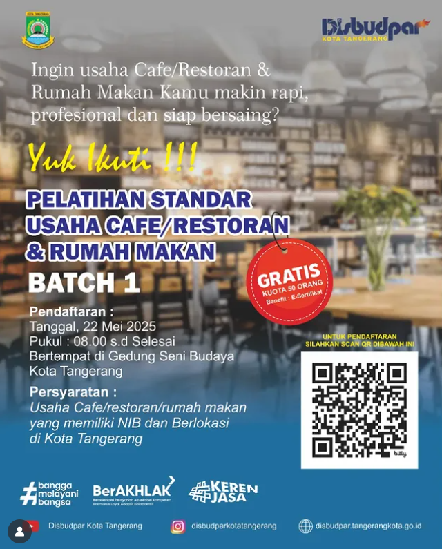 29 Jul 2025 14:00 Disbudpar Kota Tangerang Gelar Pelatihan Standarisasi Usaha Café dan Restoran untuk Tingkatkan Kualitas Layanan Pariwisata Read More 25 Jul 2025 13:55 Disbudpar Kota Tangerang Kolaborasi dengan Kemenparekraf dan LSP Maestro Indonesia Gelar Sertifikasi Kompetensi Bidang Gastronomi Read More 23 Jul 2025 13:52 Asah Kemampuan Bermain Biola di Pelatihan Biola Tingkat Menengah Kota Tangerang! Read More 22 Jul 2025 13:45 Pelatihan Fotografi Gratis, Yuk Asah Kemampuanmu di Gedung Seni Budaya Kota Tangerang! Read More 21 Jul 2025 13:44 Disbudpar, DPU, dan Kominfo Kota Tangerang Bersinergi Siapkan Partisipasi dalam Bhumandala Award 2025 Read More 18 Jul 2025 13:40 Hotel Santika Regional Tangerang Kolaborasi dengan DLH, Bank Sampah, dan Kang Nong Gelar Aksi Bersih-Bersih Pasar Lama Read More 17 Jul 2025 13:37 Dukung SDM Pariwisata yang Kompeten, Disbudpar Kota Tangerang Beri Dukungan pada Sertifikasi Kompetensi Kerja Read More 17 Jul 2025 13:35 Satgas1016 Gerak Cepat Evakuasi Pohon Tumbang di Kota Tangerang Read More 16 Jul 2025 13:33 Taman Tematik Kota Tangerang Ramai Dikunjungi, Satgas1016 Terus Lakukan Edukasi dan Pengawasan Read More 14 Jul 2025 08:24 Penataan Taman di Eks Pasar Anyar Terus Berlanjut: Wujudkan Ruang Hijau yang Nyaman dan Fungsional Read More 13 Jul 2025 08:22 Kadis Budpar Kota Tangerang Boyke Urif Hermawan Hadiri Pelantikan Pengurus KOSTI: Lestarikan Budaya Lewat Gaya Hidup Sehat Read More 11 Jul 2025 08:20 Pengajian Pegawai Disbudpar Kota Tangerang Bersama KH. Zuhri Fauzi: Empat Pertanyaan di Hari Akhir Read More 10 Jul 2025 14:36 Disbudpar Kota Tangerang x UMT, Sinergi Budaya dan Generasi Muda Read More 09 Jul 2025 14:33 Disbudpar Melakukan Pemeliharaan Rutin, Wujud Komitmen Jaga Keindahan Kota Read More 07 Jul 2025 14:21 Pamumingsolam Hadir Lagi, Warnai Akhir Pekan Warga Tangerang! Read More 06 Jul 2025 08:15 Pegawai Disbudpar Ikuti Jalan Sarungan Festival Al-Azhom 2025 Read More 04 Jul 2025 14:18 Disbudpar Melakukan Pengecatan Kanstin di Jalan TMP Taruna Read More 03 Jul 2025 14:15 Peremajaan Gapura Puspem oleh Tim Dekorasi Kota dan Penebangan Read More 01 Jul 2025 14:05 Kadisbudpar Dampingi Wali Kota Tangerang Kunjungi SMPN 1 untuk Survey Pemangkasan Pohon Read More 30 Jun 2025 14:00 Disbudpar Ikuti Rakor Penilaian Innovative Government Awards (IGA) Bersama Bappeda Read More 28 Jun 2025 13:58 Satgas 1016 Disbudpar Gerak Cepat Evakuasi Pohon Tumbang Read More 26 Jun 2025 13:55 Kunjungan Dosen dan Mahasiswa Institute Pariwisata Trisakti ke Kampung Beksi Batu Sari Read More 26 Jun 2025 13:51 Disbudpar Kota Tangerang Meriahkan Pembukaan Festival Al Adzom 2025 Read More 26 Jun 2025 13:48 Disbudpar Kota Tangerang Melakukan Kegiatan Peningkatan Kualitas Usaha Kuliner di Cibodas Kota Tangerang Read More 21 Jun 2025 13:19 Apel Penertiban Pasar Anyar: Wujud Kolaborasi untuk Kawasan Perdagangan yang Tertib Read More 20 Jun 2025 13:17 Hajatan Budaya Kecamatan Batuceper 2025: Rayakan Kekayaan Tradisi dan Kebersamaan Read More 19 Jun 2025 13:13 Antisipasi Pohon Tumbang, Tim Penebangan Lakukan Pemangkasan Rutin di RTH Kota Tangerang Read More 18 Jun 2025 13:12 Tindak Vandalisme Masih Terjadi, Tim Dekorasi Kota Lakukan Penanganan di Kolong Tol Cipondoh Read More 18 Jun 2025 13:10 Satgas 1016 Gerak Cepat Tangani Pohon Tumbang di Wilayah Kota Tangerang Read More 18 Jun 2025 13:08 Pelatihan Olah Vokal 2025, Disbudpar Kota Tangerang Cetak Talenta Muda Berprestasi Read More 15 Jun 2025 13:05 Kadisbubpar Hadiri Rangkaian Milad Forkabi & KPC Blosso Read More 13 Jun 2025 13:01 Disbudpar Kota Tangerang Gelar Pelatihan Standar Usaha Kafe, Restoran, dan Rumah Makan Read More 11 Jun 2025 12:59 Kota Tangerang Siap Cetak Talenta Muda Lewat Audisi Gita Bahana Nusantara 2025 Read More 05 Jun 2025 12:57 OPD Kota Tangerang Gelar Aksi “Bersama Bersihin Tangerang” di Pasar Anyar Read More 04 Jun 2025 12:53 Persiapkan Dirimu! Pelatihan Olah Vokal Segera Digelar di Kota Tangerang Read More 03 Jun 2025 12:50 Program 3G Kota Tangerang: Wujud Nyata Pemerintah Hadir untuk Warga Read More 28 May 2025 12:47 Selamat kepada Kang dan Nong Terpilih 2025! Read More 23 May 2025 13:40 Semarak Festival Literasi & Mookervaart 2025, Disbudpar Kota Tangerang Gelar Aksi Penanaman Pohon Read More 23 May 2025 12:45 Para Finalis Kang Nong Kunjungi Pusat Pemerintahan Kota Tangerang Read More 22 May 2025 13:36 Disbudpar Kota Tangerang Dampingi Pelaku Usaha Daftar Sertifikasi Halal, Dorong Produk Lokal Makin Kompetitif Read More 22 May 2025 13:34 Disbudpar Kota Tangerang Gelar Pelatihan Standar Usaha Kafe dan Restoran untuk Tingkatkan Daya Saing Kuliner Read More 21 May 2025 13:30 Finalis Kang Nong Kota Tangerang Kunjungi Tangerang Live Room, Kenali Inovasi Layanan Publik Kota Read More 20 May 2025 13:27 Disbudpar Kota Tangerang Gelar Lomba Foto Cagar Budaya dalam Festival Literasi dan Mookervaart 2025 Read More 17 May 2025 11:44 Disbudpar Kota Tangerang Gelar Pelatihan Standar Usaha untuk Café, Restoran, dan Rumah Makan Read More 15 May 2025 11:42 Disbudpar Kota Tangerang Gelar Edukasi Inovasi Botol Plastik di SMAN 12 Kota Tangerang dalam Program P5 Read More 15 May 2025 11:36 Disbudpar Kota Tangerang Selenggarakan Pelatihan Kebersihan Perhotelan, Siapkan SDM Unggul di Bidang Hospitality Read More 15 May 2025 11:34 Disbudpar Kota Tangerang Gelar Lomba Qasidah Semarakkan Festival Literasi dan Mookervaart 2025 Read More 14 May 2025 11:31 Disbudpar Kota Tangerang Gelar Pelatihan Standar Usaha Kafe, Rumah Makan, dan Restoran Read More 14 May 2025 11:27 Disbudpar Kota Tangerang Gelar Pelatihan Pramusaji, Buka Peluang Tingkatkan Kompetensi Generasi Muda Read More 11 May 2025 11:25 Pemilihan Kang Nong Terfavorit Dibuka, Masyarakat Kota Tangerang Diajak Berikan Dukungan Read More 09 May 2025 11:21 Finalis Kang Nong Kota Tangerang Jalani Pembekalan dan Latihan Tari Menjelang Malam Penobatan Read More 08 May 2025 11:16 Kontingen Budaya Kota Tangerang Curi Perhatian di Apeksi VII Surabaya Read More 06 May 2025 09:09 KOT