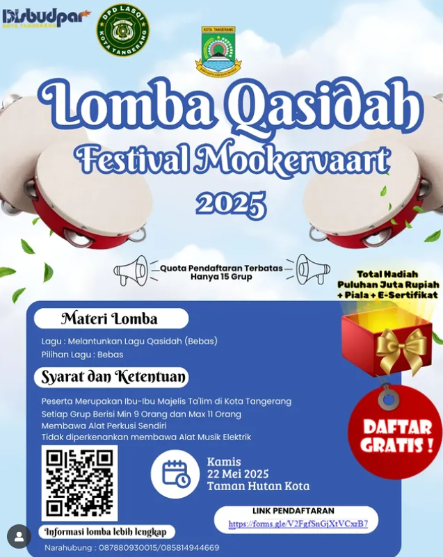 18 Jun 2025 13:10 Satgas 1016 Gerak Cepat Tangani Pohon Tumbang di Wilayah Kota Tangerang Read More 18 Jun 2025 13:08 Pelatihan Olah Vokal 2025, Disbudpar Kota Tangerang Cetak Talenta Muda Berprestasi Read More 15 Jun 2025 13:05 Kadisbubpar Hadiri Rangkaian Milad Forkabi & KPC Blosso Read More 13 Jun 2025 13:01 Disbudpar Kota Tangerang Gelar Pelatihan Standar Usaha Kafe, Restoran, dan Rumah Makan Read More 11 Jun 2025 12:59 Kota Tangerang Siap Cetak Talenta Muda Lewat Audisi Gita Bahana Nusantara 2025 Read More 05 Jun 2025 12:57 OPD Kota Tangerang Gelar Aksi “Bersama Bersihin Tangerang” di Pasar Anyar Read More 04 Jun 2025 12:53 Persiapkan Dirimu! Pelatihan Olah Vokal Segera Digelar di Kota Tangerang Read More 03 Jun 2025 12:50 Program 3G Kota Tangerang: Wujud Nyata Pemerintah Hadir untuk Warga Read More 28 May 2025 12:47 Selamat kepada Kang dan Nong Terpilih 2025! Read More 23 May 2025 13:40 Semarak Festival Literasi & Mookervaart 2025, Disbudpar Kota Tangerang Gelar Aksi Penanaman Pohon Read More 23 May 2025 12:45 Para Finalis Kang Nong Kunjungi Pusat Pemerintahan Kota Tangerang Read More 22 May 2025 13:36 Disbudpar Kota Tangerang Dampingi Pelaku Usaha Daftar Sertifikasi Halal, Dorong Produk Lokal Makin Kompetitif Read More 22 May 2025 13:34 Disbudpar Kota Tangerang Gelar Pelatihan Standar Usaha Kafe dan Restoran untuk Tingkatkan Daya Saing Kuliner Read More 21 May 2025 13:30 Finalis Kang Nong Kota Tangerang Kunjungi Tangerang Live Room, Kenali Inovasi Layanan Publik Kota Read More 20 May 2025 13:27 Disbudpar Kota Tangerang Gelar Lomba Foto Cagar Budaya dalam Festival Literasi dan Mookervaart 2025 Read More 17 May 2025 11:44 Disbudpar Kota Tangerang Gelar Pelatihan Standar Usaha untuk Café, Restoran, dan Rumah Makan Read More 15 May 2025 11:42 Disbudpar Kota Tangerang Gelar Edukasi Inovasi Botol Plastik di SMAN 12 Kota Tangerang dalam Program P5 Read More 15 May 2025 11:36 Disbudpar Kota Tangerang Selenggarakan Pelatihan Kebersihan Perhotelan, Siapkan SDM Unggul di Bidang Hospitality Read More 15 May 2025 11:34 Disbudpar Kota Tangerang Gelar Lomba Qasidah Semarakkan Festival Literasi dan Mookervaart 2025 Read More 14 May 2025 11:31 Disbudpar Kota Tangerang Gelar Pelatihan Standar Usaha Kafe, Rumah Makan, dan Restoran Read More 14 May 2025 11:27 Disbudpar Kota Tangerang Gelar Pelatihan Pramusaji, Buka Peluang Tingkatkan Kompetensi Generasi Muda Read More 11 May 2025 11:25 Pemilihan Kang Nong Terfavorit Dibuka, Masyarakat Kota Tangerang Diajak Berikan Dukungan Read More 09 May 2025 11:21 Finalis Kang Nong Kota Tangerang Jalani Pembekalan dan Latihan Tari Menjelang Malam Penobatan Read More 08 May 2025 11:16 Kontingen Budaya Kota Tangerang Curi Perhatian di Apeksi VII Surabaya Read More 06 May 2025 09:09 KOTA TANGERANG SIAP PENTAS DIPANGGUNG NASIONAL APEKSI SURABAYA 2025 Read More 04 May 2025 10:57 DIALOG BERSAMA SENIMAN DAN MUSISI KOTA TANGERANG Read More 04 May 2025 07:30 KERJA BAKTI SEPANJANG KALI SIPON Read More 03 May 2025 10:57 Pra Karantina Kang Nong Kota Tangerang 2025 Resmi Dimulai Read More 01 May 2025 10:48 TANAM POHON BERSAMA HIMPUNAN MAHASISWA PARIWISATA Read More 30 Apr 2025 10:42 Disbudpar Kota Tangerang Gelar Halal Bihalal Bersama Pegiat Seni Budaya dan Tradisi Read More 21 Apr 2025 10:24 PELAJAR PERINGATI HARI KARTINI DI TAMAN TEMATIK KOTA TANGERANG Read More 02 Apr 2025 10:17 WISATA KANO LIBUR LEBARAN 2025 Read More 25 Mar 2025 10:09 BABAT RUMPUT UNTUK SOLAT IED, GRATIS! Read More 18 Mar 2025 10:01 ASURANSI POHON TUMBANG BAGI WARGA TANGERANG Read More 09 Mar 2025 09:56 GRAND FINAL PEMMILIHAN CIDE DAN KODE BENTENG Read More 25 Feb 2025 09:38 Jakarta Premium Outlets - Tangerang Read More 24 Feb 2025 09:38 JASA PARIWISATA PADA BULAN SUCI RAMADHAN 1446H/2025 Read More 18 Feb 2025 17:30 PREPARE YOURSELF FOR PEMILIHAN KANG NONG KOTA TANGERANG 2025! Read More 25 Jan 2025 18:54 DISBUDPAR KOTA TANGERANG SIAGAKAN 330 PETUGAS DI TAMAN KOTA SELAMA LIBUR PANJANG Read More 01 Jan 2025 00:01 TAHUN BARU 2025 Read More 06 Dec 2024 10:46 WISATA PERAHU KANO SPESIAL EVENT AKHIR TAHUN 2024 Read More 21 Nov 2024 10:23 OFFICIAL LOGO DISBUDPAR Read More 12 Nov 2024 10:06 PENGAJUAN PANGKAS POHON DIKOTA TANGERANG Read More 10 Nov 2024 10:20 WISATA PERAHU KANO Read More 03 Nov 2024 10:01 LOMBA TARI KREASI TRADISIONAL NUSANTARA 2024 Read More 03 Nov 2024 09:53 LOMBA PENCAK SILAT FESTIVAL BUDAYA 2024 Read More 02 Nov 2024 09:41 LOMBA QASIDAH FESTIVAL BUDAYA TAHUN 2024 Read More 01 Nov 2024 09:47 LOMBA BACA PUISI FESTIVAL BUDAYA 2024 Read More 20 Oct 2024 09:55 WASPADA POHON TUMBANG Read More 27 Sep 2024 11:01 Ayo Wujudkan Kota Tangerang sebagai Smart City yang Lebih Baik! Read More 21 Sep 2024 10:03 PROSESI 12 TAHUNAN GOTONG TOAPEKONG 2024 Read More 07 Aug 2024 09:36 LOMBA FOTO PONSEL CAGAR BUDAYA KOTA TANGERANG Read More 20 Jul 2024 17:52 FESTIVAL CISADANE 2024 KOTA TANGERANG Read More 17 Jul 2024 17:54 LOMBA TARI NANDAK 2024 KOTA TANGERANG Read More 05 Apr 2024 09:09 PELAYANAN BABAT RUMPUT Read More 27 Mar 2024 09:13 AUDISI GITA BAHANA NUSANTARA KOTA TANGERANG 2024 Read More 17 Mar 2024 09:16 WISATA PERAHU KANO BUKA DIBULAN RAMADAN Read More 06 Mar 2024 09:20 ATURAN JAM BUKA RUMAH MAKAN DAN PENGHENTIAN SEMENTARA TEMPAT JASA USAHA HIBURAN UMUM Read More 15 Feb 2024 12:22 ASURANSI POHON TUMBANG Read More 22 Dec 2023 22:00 FESTIVAL CISADANE KOTA TANGERANG 2023 Read More 11 Dec 2023 15:28 FESTIVAL BUDAYA KOTA TANGERANG TAHUN 2023 Read More 14 Oct 2023 15:30 FESTIVAL MOOKERVAART KOTA TANGERANG 2023 Read More 27 Sep 2023 10:58 FESTIVAL MAULID KOTA TANGERANG Read More 30 Aug 2023 21:00 WISATA KANO Read More 23 Aug 2023 09:00 SOSIALISASI CAGAR BUDAYA KOTA TANGERANG Read More 21 Jul 2023 09:36 FESTIVAL PEH CUN KOTA TANGERANG 2023 Read More 07 Jul 2023 18:00 GRAND FINAL PEMILIHAN KANG NONG KOTA TANGERANG 2023 Read More 16 May 2023 14:01 Lomba Vlog HUT RI ke-77 Read More 03 May 2023 12:45 Audisi Gita Bahana Nusantara 2023 Kota Tangerang