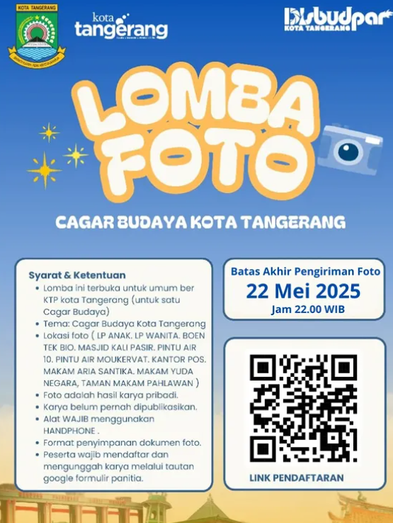 23 Aug 2023 09:00 SOSIALISASI CAGAR BUDAYA KOTA TANGERANG Read More 21 Jul 2023 09:36 FESTIVAL PEH CUN KOTA TANGERANG 2023 Read More 07 Jul 2023 18:00 GRAND FINAL PEMILIHAN KANG NONG KOTA TANGERANG 2023 Read More 16 May 2023 14:01 Lomba Vlog HUT RI ke-77 Read More 03 May 2023 12:45 Audisi Gita Bahana Nusantara 2023 Kota Tangerang