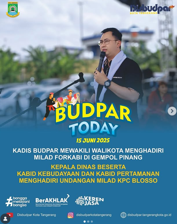 14 May 2025 11:27 Disbudpar Kota Tangerang Gelar Pelatihan Pramusaji, Buka Peluang Tingkatkan Kompetensi Generasi Muda Read More 11 May 2025 11:25 Pemilihan Kang Nong Terfavorit Dibuka, Masyarakat Kota Tangerang Diajak Berikan Dukungan Read More 09 May 2025 11:21 Finalis Kang Nong Kota Tangerang Jalani Pembekalan dan Latihan Tari Menjelang Malam Penobatan Read More 08 May 2025 11:16 Kontingen Budaya Kota Tangerang Curi Perhatian di Apeksi VII Surabaya Read More 06 May 2025 09:09 KOTA TANGERANG SIAP PENTAS DIPANGGUNG NASIONAL APEKSI SURABAYA 2025 Read More 04 May 2025 10:57 DIALOG BERSAMA SENIMAN DAN MUSISI KOTA TANGERANG Read More 04 May 2025 07:30 KERJA BAKTI SEPANJANG KALI SIPON Read More 03 May 2025 10:57 Pra Karantina Kang Nong Kota Tangerang 2025 Resmi Dimulai Read More 01 May 2025 10:48 TANAM POHON BERSAMA HIMPUNAN MAHASISWA PARIWISATA Read More 30 Apr 2025 10:42 Disbudpar Kota Tangerang Gelar Halal Bihalal Bersama Pegiat Seni Budaya dan Tradisi Read More 21 Apr 2025 10:24 PELAJAR PERINGATI HARI KARTINI DI TAMAN TEMATIK KOTA TANGERANG Read More 02 Apr 2025 10:17 WISATA KANO LIBUR LEBARAN 2025 Read More 25 Mar 2025 10:09 BABAT RUMPUT UNTUK SOLAT IED, GRATIS! Read More 18 Mar 2025 10:01 ASURANSI POHON TUMBANG BAGI WARGA TANGERANG Read More 09 Mar 2025 09:56 GRAND FINAL PEMMILIHAN CIDE DAN KODE BENTENG Read More 25 Feb 2025 09:38 Jakarta Premium Outlets - Tangerang Read More 24 Feb 2025 09:38 JASA PARIWISATA PADA BULAN SUCI RAMADHAN 1446H/2025 Read More 18 Feb 2025 17:30 PREPARE YOURSELF FOR PEMILIHAN KANG NONG KOTA TANGERANG 2025! Read More 25 Jan 2025 18:54 DISBUDPAR KOTA TANGERANG SIAGAKAN 330 PETUGAS DI TAMAN KOTA SELAMA LIBUR PANJANG Read More 01 Jan 2025 00:01 TAHUN BARU 2025 Read More 06 Dec 2024 10:46 WISATA PERAHU KANO SPESIAL EVENT AKHIR TAHUN 2024 Read More 21 Nov 2024 10:23 OFFICIAL LOGO DISBUDPAR Read More 12 Nov 2024 10:06 PENGAJUAN PANGKAS POHON DIKOTA TANGERANG Read More 10 Nov 2024 10:20 WISATA PERAHU KANO Read More 03 Nov 2024 10:01 LOMBA TARI KREASI TRADISIONAL NUSANTARA 2024 Read More 03 Nov 2024 09:53 LOMBA PENCAK SILAT FESTIVAL BUDAYA 2024 Read More 02 Nov 2024 09:41 LOMBA QASIDAH FESTIVAL BUDAYA TAHUN 2024 Read More 01 Nov 2024 09:47 LOMBA BACA PUISI FESTIVAL BUDAYA 2024 Read More 20 Oct 2024 09:55 WASPADA POHON TUMBANG Read More 27 Sep 2024 11:01 Ayo Wujudkan Kota Tangerang sebagai Smart City yang Lebih Baik! Read More 21 Sep 2024 10:03 PROSESI 12 TAHUNAN GOTONG TOAPEKONG 2024 Read More 07 Aug 2024 09:36 LOMBA FOTO PONSEL CAGAR BUDAYA KOTA TANGERANG Read More 20 Jul 2024 17:52 FESTIVAL CISADANE 2024 KOTA TANGERANG Read More 17 Jul 2024 17:54 LOMBA TARI NANDAK 2024 KOTA TANGERANG Read More 05 Apr 2024 09:09 PELAYANAN BABAT RUMPUT Read More 27 Mar 2024 09:13 AUDISI GITA BAHANA NUSANTARA KOTA TANGERANG 2024 Read More 17 Mar 2024 09:16 WISATA PERAHU KANO BUKA DIBULAN RAMADAN Read More 06 Mar 2024 09:20 ATURAN JAM BUKA RUMAH MAKAN DAN PENGHENTIAN SEMENTARA TEMPAT JASA USAHA HIBURAN UMUM Read More 15 Feb 2024 12:22 ASURANSI POHON TUMBANG Read More 22 Dec 2023 22:00 FESTIVAL CISADANE KOTA TANGERANG 2023 Read More 11 Dec 2023 15:28 FESTIVAL BUDAYA KOTA TANGERANG TAHUN 2023 Read More 14 Oct 2023 15:30 FESTIVAL MOOKERVAART KOTA TANGERANG 2023 Read More 27 Sep 2023 10:58 FESTIVAL MAULID KOTA TANGERANG Read More 30 Aug 2023 21:00 WISATA KANO Read More 23 Aug 2023 09:00 SOSIALISASI CAGAR BUDAYA KOTA TANGERANG Read More 21 Jul 2023 09:36 FESTIVAL PEH CUN KOTA TANGERANG 2023 Read More 07 Jul 2023 18:00 GRAND FINAL PEMILIHAN KANG NONG KOTA TANGERANG 2023 Read More 16 May 2023 14:01 Lomba Vlog HUT RI ke-77 Read More 03 May 2023 12:45 Audisi Gita Bahana Nusantara 2023 Kota Tangerang