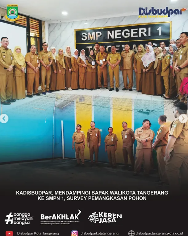 26 Aug 2025 11:51 Disbudpar Kota Tangerang Serahkan Hadiah kepada Pemenang Lomba Video Kreatif Read More 23 Aug 2025 11:48 Kadis Budpar Kota Tangerang Dampingi Wali Kota dalam Pembukaan PERBASI CUP 2025 Read More 21 Aug 2025 11:46 Kadis Budpar Kota Tangerang Dampingi Wali Kota dalam Kegiatan Verifikasi Dokumen KKS Tingkat Nasional 2025 Read More 20 Aug 2025 11:41 Semarak Gowes Kemerdekaan 2025, Rayakan HUT RI ke-80 dengan Semangat Sehat dan Gembira! Read More 12 Aug 2025 11:36 Disbudpar Kota Tangerang Gelar Lomba Video Kreatif Destinasi Wisata, Ajak Masyarakat Promosikan Keindahan Kota Tangerang Read More 11 Aug 2025 11:34 Disbudpar Kota Tangerang Sukses Gelar Kegiatan Pengembangan Kompetensi Fotografer Read More 09 Aug 2025 11:32 Menuju Langit Biru Tangerang, Wujud Komitmen Bersama untuk Udara yang Lebih Bersih Read More 09 Aug 2025 11:30 Disbudpar Kota Tangerang Ikut Sukseskan Kerja Bakti HUT RI ke-80 di Kecamatan Neglasari Read More 07 Aug 2025 11:28 Disbudpar Kota Tangerang Ikuti Kegiatan Promosi Pariwisata dan UMKM di Pendopo Art Center Purworejo Read More 07 Aug 2025 11:26 Antisipasi Pohon Tumbang, Disbudpar Kota Tangerang Lakukan Pemangkasan Rutin di RTH Read More 07 Aug 2025 11:25 Disbudpar Kota Tangerang Hadir di Borobudur Expo 2025, Promosikan Potensi Wisata dan Ekonomi Kreatif Unggulan Read More 06 Aug 2025 11:23 Disbudpar Kota Tangerang Gelar Pelatihan Pengembangan Potensi Fotografer untuk Dongkrak Promosi Pariwisata Read More 05 Aug 2025 11:20 Semarakkan Semangat Kebangsaan, Disbudpar Kota Tangerang Bagikan 100 Bendera Merah Putih di Taman Pramuka Read More 04 Aug 2025 14:14 Pemkot Tangerang Serahkan Manfaat Asuransi Pohon Tumbang, Perkuat Mitigasi Melalui Aplikasi SIGAMPANG Read More 04 Aug 2025 11:15 Disbudpar Kota Tangerang Serahkan Klaim Asuransi Public Liability kepada Warga Terdampak Pohon Tumbang Read More 03 Aug 2025 14:13 Kota Tangerang Raih Penghargaan Kelompok Terbaik dalam Program Penguatan City Branding di Banyuwangi Read More 01 Aug 2025 14:05 OPD Kota Tangerang Gelar Rapat Persiapan Car Free Day Sambut HUT RI ke-80 Read More 30 Jul 2025 14:03 Disbudpar Kota Tangerang Gelar Pelatihan Biola Gratis, Disambut Antusias Peserta dari Berbagai Kalangan Read More 30 Jul 2025 14:01 Disbudpar Kota Tangerang Gelar Pelatihan Biola Tingkat Menengah untuk Asah Bakat Musisi Muda Read More 29 Jul 2025 14:00 Disbudpar Kota Tangerang Gelar Pelatihan Standarisasi Usaha Café dan Restoran untuk Tingkatkan Kualitas Layanan Pariwisata Read More 25 Jul 2025 13:55 Disbudpar Kota Tangerang Kolaborasi dengan Kemenparekraf dan LSP Maestro Indonesia Gelar Sertifikasi Kompetensi Bidang Gastronomi Read More 23 Jul 2025 13:52 Asah Kemampuan Bermain Biola di Pelatihan Biola Tingkat Menengah Kota Tangerang! Read More 22 Jul 2025 13:45 Pelatihan Fotografi Gratis, Yuk Asah Kemampuanmu di Gedung Seni Budaya Kota Tangerang! Read More 21 Jul 2025 13:44 Disbudpar, DPU, dan Kominfo Kota Tangerang Bersinergi Siapkan Partisipasi dalam Bhumandala Award 2025 Read More 18 Jul 2025 13:40 Hotel Santika Regional Tangerang Kolaborasi dengan DLH, Bank Sampah, dan Kang Nong Gelar Aksi Bersih-Bersih Pasar Lama Read More 17 Jul 2025 13:37 Dukung SDM Pariwisata yang Kompeten, Disbudpar Kota Tangerang Beri Dukungan pada Sertifikasi Kompetensi Kerja Read More 17 Jul 2025 13:35 Satgas1016 Gerak Cepat Evakuasi Pohon Tumbang di Kota Tangerang Read More 16 Jul 2025 13:33 Taman Tematik Kota Tangerang Ramai Dikunjungi, Satgas1016 Terus Lakukan Edukasi dan Pengawasan Read More 14 Jul 2025 08:24 Penataan Taman di Eks Pasar Anyar Terus Berlanjut: Wujudkan Ruang Hijau yang Nyaman dan Fungsional Read More 13 Jul 2025 08:22 Kadis Budpar Kota Tangerang Boyke Urif Hermawan Hadiri Pelantikan Pengurus KOSTI: Lestarikan Budaya Lewat Gaya Hidup Sehat Read More 11 Jul 2025 08:20 Pengajian Pegawai Disbudpar Kota Tangerang Bersama KH. Zuhri Fauzi: Empat Pertanyaan di Hari Akhir Read More 10 Jul 2025 14:36 Disbudpar Kota Tangerang x UMT, Sinergi Budaya dan Generasi Muda Read More 09 Jul 2025 14:33 Disbudpar Melakukan Pemeliharaan Rutin, Wujud Komitmen Jaga Keindahan Kota Read More 07 Jul 2025 14:21 Pamumingsolam Hadir Lagi, Warnai Akhir Pekan Warga Tangerang! Read More 06 Jul 2025 08:15 Pegawai Disbudpar Ikuti Jalan Sarungan Festival Al-Azhom 2025 Read More 04 Jul 2025 14:18 Disbudpar Melakukan Pengecatan Kanstin di Jalan TMP Taruna Read More 03 Jul 2025 14:15 Peremajaan Gapura Puspem oleh Tim Dekorasi Kota dan Penebangan Read More 01 Jul 2025 14:05 Kadisbudpar Dampingi Wali Kota Tangerang Kunjungi SMPN 1 untuk Survey Pemangkasan Pohon Read More 30 Jun 2025 14:00 Disbudpar Ikuti Rakor Penilaian Innovative Government Awards (IGA) Bersama Bappeda Read More 28 Jun 2025 13:58 Satgas 1016 Disbudpar Gerak Cepat Evakuasi Pohon Tumbang Read More 26 Jun 2025 13:55 Kunjungan Dosen dan Mahasiswa Institute Pariwisata Trisakti ke Kampung Beksi Batu Sari Read More 26 Jun 2025 13:51 Disbudpar Kota Tangerang Meriahkan Pembukaan Festival Al Adzom 2025 Read More 26 Jun 2025 13:48 Disbudpar Kota Tangerang Melakukan Kegiatan Peningkatan Kualitas Usaha Kuliner di Cibodas Kota Tangerang Read More 21 Jun 2025 13:19 Apel Penertiban Pasar Anyar: Wujud Kolaborasi untuk Kawasan Perdagangan yang Tertib Read More 20 Jun 2025 13:17 Hajatan Budaya Kecamatan Batuceper 2025: Rayakan Kekayaan Tradisi dan Kebersamaan Read More 19 Jun 2025 13:13 Antisipasi Pohon Tumbang, Tim Penebangan Lakukan Pemangkasan Rutin di RTH Kota Tangerang Read More 18 Jun 2025 13:12 Tindak Vandalisme Masih Terjadi, Tim Dekorasi Kota Lakukan Penanganan di Kolong Tol Cipondoh Read More 18 Jun 2025 13:10 Satgas 1016 Gerak Cepat Tangani Pohon Tumbang di Wilayah Kota Tangerang Read More 18 Jun 2025 13:08 Pelatihan Olah Vokal 2025, Disbudpar Kota Tangerang Cetak Talenta Muda Berprestasi Read More 15 Jun 2025 13:05 Kadisbubpar Hadiri Rangkaian Milad Forkabi & KPC Blosso Read More 13 Jun 2025 13:01 Disbudpar Kota Tangerang Gelar Pelatihan Standar Usaha Kafe, Restoran, dan Rumah Makan Read More 11 Jun 20