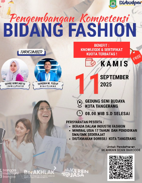 07 Sep 2025 12:03 Pemkot Tangerang Gelar Pengembangan Kompetensi Bidang Fashion Read More 04 Sep 2025 11:58 Disbudpar Kota Tangerang Ikuti Arak-Arakan Perahu dan Gunungan Maulidan Al-Ittihad 1447 H / 2025 M Read More 04 Sep 2025 11:55 Disbudpar Kota Tangerang Gelar Kegiatan Peningkatan Kompetensi Fashion untuk Dukung Industri Kreatif Lokal Read More 31 Aug 2025 11:53 Disbudpar Kota Tangerang Ikut Sukseskan Aksi Bersih-Bersih Sungai Cisadane dan Penanaman Pohon di Kampung Berkelir Read More 26 Aug 2025 11:51 Disbudpar Kota Tangerang Serahkan Hadiah kepada Pemenang Lomba Video Kreatif Read More 23 Aug 2025 11:48 Kadis Budpar Kota Tangerang Dampingi Wali Kota dalam Pembukaan PERBASI CUP 2025 Read More 21 Aug 2025 11:46 Kadis Budpar Kota Tangerang Dampingi Wali Kota dalam Kegiatan Verifikasi Dokumen KKS Tingkat Nasional 2025 Read More 20 Aug 2025 11:41 Semarak Gowes Kemerdekaan 2025, Rayakan HUT RI ke-80 dengan Semangat Sehat dan Gembira! Read More 12 Aug 2025 11:36 Disbudpar Kota Tangerang Gelar Lomba Video Kreatif Destinasi Wisata, Ajak Masyarakat Promosikan Keindahan Kota Tangerang Read More 11 Aug 2025 11:34 Disbudpar Kota Tangerang Sukses Gelar Kegiatan Pengembangan Kompetensi Fotografer Read More 09 Aug 2025 11:32 Menuju Langit Biru Tangerang, Wujud Komitmen Bersama untuk Udara yang Lebih Bersih Read More 09 Aug 2025 11:30 Disbudpar Kota Tangerang Ikut Sukseskan Kerja Bakti HUT RI ke-80 di Kecamatan Neglasari Read More 07 Aug 2025 11:28 Disbudpar Kota Tangerang Ikuti Kegiatan Promosi Pariwisata dan UMKM di Pendopo Art Center Purworejo Read More 07 Aug 2025 11:26 Antisipasi Pohon Tumbang, Disbudpar Kota Tangerang Lakukan Pemangkasan Rutin di RTH Read More 07 Aug 2025 11:25 Disbudpar Kota Tangerang Hadir di Borobudur Expo 2025, Promosikan Potensi Wisata dan Ekonomi Kreatif Unggulan Read More 06 Aug 2025 11:23 Disbudpar Kota Tangerang Gelar Pelatihan Pengembangan Potensi Fotografer untuk Dongkrak Promosi Pariwisata Read More 05 Aug 2025 11:20 Semarakkan Semangat Kebangsaan, Disbudpar Kota Tangerang Bagikan 100 Bendera Merah Putih di Taman Pramuka Read More 04 Aug 2025 14:14 Pemkot Tangerang Serahkan Manfaat Asuransi Pohon Tumbang, Perkuat Mitigasi Melalui Aplikasi SIGAMPANG Read More 04 Aug 2025 11:15 Disbudpar Kota Tangerang Serahkan Klaim Asuransi Public Liability kepada Warga Terdampak Pohon Tumbang Read More 03 Aug 2025 14:13 Kota Tangerang Raih Penghargaan Kelompok Terbaik dalam Program Penguatan City Branding di Banyuwangi Read More 01 Aug 2025 14:05 OPD Kota Tangerang Gelar Rapat Persiapan Car Free Day Sambut HUT RI ke-80 Read More 30 Jul 2025 14:03 Disbudpar Kota Tangerang Gelar Pelatihan Biola Gratis, Disambut Antusias Peserta dari Berbagai Kalangan Read More 30 Jul 2025 14:01 Disbudpar Kota Tangerang Gelar Pelatihan Biola Tingkat Menengah untuk Asah Bakat Musisi Muda Read More 29 Jul 2025 14:00 Disbudpar Kota Tangerang Gelar Pelatihan Standarisasi Usaha Café dan Restoran untuk Tingkatkan Kualitas Layanan Pariwisata Read More 25 Jul 2025 13:55 Disbudpar Kota Tangerang Kolaborasi dengan Kemenparekraf dan LSP Maestro Indonesia Gelar Sertifikasi Kompetensi Bidang Gastronomi Read More 23 Jul 2025 13:52 Asah Kemampuan Bermain Biola di Pelatihan Biola Tingkat Menengah Kota Tangerang! Read More 22 Jul 2025 13:45 Pelatihan Fotografi Gratis, Yuk Asah Kemampuanmu di Gedung Seni Budaya Kota Tangerang! Read More 21 Jul 2025 13:44 Disbudpar, DPU, dan Kominfo Kota Tangerang Bersinergi Siapkan Partisipasi dalam Bhumandala Award 2025 Read More 18 Jul 2025 13:40 Hotel Santika Regional Tangerang Kolaborasi dengan DLH, Bank Sampah, dan Kang Nong Gelar Aksi Bersih-Bersih Pasar Lama Read More 17 Jul 2025 13:37 Dukung SDM Pariwisata yang Kompeten, Disbudpar Kota Tangerang Beri Dukungan pada Sertifikasi Kompetensi Kerja Read More 17 Jul 2025 13:35 Satgas1016 Gerak Cepat Evakuasi Pohon Tumbang di Kota Tangerang Read More 16 Jul 2025 13:33 Taman Tematik Kota Tangerang Ramai Dikunjungi, Satgas1016 Terus Lakukan Edukasi dan Pengawasan Read More 14 Jul 2025 08:24 Penataan Taman di Eks Pasar Anyar Terus Berlanjut: Wujudkan Ruang Hijau yang Nyaman dan Fungsional Read More 13 Jul 2025 08:22 Kadis Budpar Kota Tangerang Boyke Urif Hermawan Hadiri Pelantikan Pengurus KOSTI: Lestarikan Budaya Lewat Gaya Hidup Sehat Read More 11 Jul 2025 08:20 Pengajian Pegawai Disbudpar Kota Tangerang Bersama KH. Zuhri Fauzi: Empat Pertanyaan di Hari Akhir Read More 10 Jul 2025 14:36 Disbudpar Kota Tangerang x UMT, Sinergi Budaya dan Generasi Muda Read More 09 Jul 2025 14:33 Disbudpar Melakukan Pemeliharaan Rutin, Wujud Komitmen Jaga Keindahan Kota Read More 07 Jul 2025 14:21 Pamumingsolam Hadir Lagi, Warnai Akhir Pekan Warga Tangerang! Read More 06 Jul 2025 08:15 Pegawai Disbudpar Ikuti Jalan Sarungan Festival Al-Azhom 2025 Read More 04 Jul 2025 14:18 Disbudpar Melakukan Pengecatan Kanstin di Jalan TMP Taruna Read More 03 Jul 2025 14:15 Peremajaan Gapura Puspem oleh Tim Dekorasi Kota dan Penebangan Read More 01 Jul 2025 14:05 Kadisbudpar Dampingi Wali Kota Tangerang Kunjungi SMPN 1 untuk Survey Pemangkasan Pohon Read More 30 Jun 2025 14:00 Disbudpar Ikuti Rakor Penilaian Innovative Government Awards (IGA) Bersama Bappeda Read More 28 Jun 2025 13:58 Satgas 1016 Disbudpar Gerak Cepat Evakuasi Pohon Tumbang Read More 26 Jun 2025 13:55 Kunjungan Dosen dan Mahasiswa Institute Pariwisata Trisakti ke Kampung Beksi Batu Sari Read More 26 Jun 2025 13:51 Disbudpar Kota Tangerang Meriahkan Pembukaan Festival Al Adzom 2025 Read More 26 Jun 2025 13:48 Disbudpar Kota Tangerang Melakukan Kegiatan Peningkatan Kualitas Usaha Kuliner di Cibodas Kota Tangerang Read More 21 Jun 2025 13:19 Apel Penertiban Pasar Anyar: Wujud Kolaborasi untuk Kawasan Perdagangan yang Tertib Read More 20 Jun 2025 13:17 Hajatan Budaya Kecamatan Batuceper 2025: Rayakan Kekayaan Tradisi dan Kebersamaan Read More 19 Jun 2025 13:13 Antisipasi Pohon Tumbang, Tim Penebangan Lakukan Pemangkasan Rutin di RTH Kota Tangerang Read More 18 Jun 2025 13:12 Tindak Vandalisme Masih Ter
