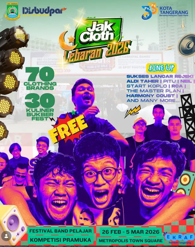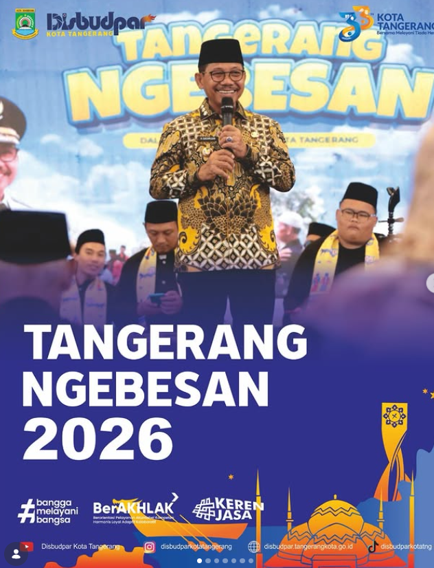 31 Mar 2026 11:00 Disbudpar Kota Tangerang Buka Sertifikasi Profesi Pariwisata Gratis, Tingkatkan Daya Saing SDM Read More 31 Mar 2026 10:58 Apel Pagi dan Halal Bi Halal Disbudpar Kota Tangerang, Perkuat Kebersamaan dan Komitmen Pelayanan Read More 15 Mar 2026 10:57 Jelang Idulfitri, Beragam Pusat Belanja di Kota Tangerang Siap Penuhi Kebutuhan Lebaran Read More 10 Mar 2026 10:55 Perkuat Ekosistem Ekraf, Pelaku Kreatif Kota Tangerang Ikuti Rakor di Provinsi Banten Read More 28 Feb 2026 10:51 JakCloth Lebaran Fair 2026 Resmi Dibuka, HUT ke-33 Kota Tangerang Makin Meriah Read More 24 Feb 2026 10:50 Culinary Day 2026 Hadir di Kota Tangerang, Semarakkan HUT ke-33 dengan Ngabuburit Penuh Kebersamaan Read More 18 Feb 2026 10:48 Wisata Kano Tetap Beroperasi Selama Ramadhan, Hadirkan Ngabuburit Sehat dan Seru di Kota Tangerang Read More 14 Feb 2026 10:45 Ide Kreatif: Ketapel Tradisional Naik Kelas, Jadi Produk Bernilai Jutaan Rupiah Read More 14 Feb 2026 10:43 Event Clothing & Hiburan Terbesar Meriahkan HUT ke-33 Kota Tangerang di Metropolis Town Square Read More 13 Feb 2026 10:53 Tangerang Ngebesan 2026, Harmoni Budaya dalam Semarak HUT Kota Tangerang Read More 13 Feb 2026 10:42 Semangat Gotong Royong Warnai Aksi Bersih-Bersih di Kawasan TMP Taruna Kota Tangerang Read More 11 Feb 2026 10:50 Tangerang Ngebesan 2026, Wujud Nyata Pelayanan Publik dalam Rangka HUT ke-33 Kota Tangerang Read More 31 Jan 2026 10:47 UMKM Kota Tangerang Tampil di INACRAFT 2026, Bawa Karya Lokal ke Panggung Internasional Read More 29 Jan 2026 10:46 Tangerang Bersholawat 2026, Semarakkan HUT ke-33 dengan Nuansa Religi dan Kebersamaan Read More 29 Jan 2026 10:42 RAKERDA BPD PHRI Provinsi Banten di Novotel Tangerang, Perkuat Sinergi Industri Pariwisata dan Ekonomi Kreatif Read More 28 Jan 2026 10:41 Festival Cisadane 2026 Masuk KEN, Kota Tangerang Torehkan Prestasi di Tingkat Nasional Read More 25 Jan 2026 10:39 Mengenang Semangat Pengabdian, 25 Januari Diperingati sebagai Hari Bhakti Taruna Read More 23 Jan 2026 09:31 Layanan Pangkas dan Asuransi Pohon dialihkan ke Dinas Lingkungan Hidup Read More 21 Jan 2026 10:37 Penguatan Kolaborasi Antar Daerah, Disbudpar Kota Tangerang dan Disporapar Kota Sukabumi Dorong Ekonomi Kreatif Berkelanjutan Read More 20 Jan 2026 10:35 Mengintip Proses Produksi Pop Laksa Instan di Galeri Bintang Sawi: Cita Rasa Lokal dalam Kemasan Modern Read More 15 Jan 2026 12:16 INILAH LOGO RESMI HUT KE-33 KOTA TANGERANG! Read More 15 Jan 2026 10:28 Bidang Pertamanan Disbudpar Kota Tangerang Dukung Penertiban Kawasan dalam Apel Penertiban Pasar Anyar Read More 14 Jan 2026 10:31 Resmi Diluncurkan, Ini Logo HUT ke-33 Kota Tangerang: Semangat Melayani Tiada Henti Read More 06 Jan 2026 08:34 Pegawai Disbudpar Kota Tangerang Gelar Giat Bersih-Bersih di Kecamatan Neglasari Read More 12 Dec 2025 10:23 Disbudpar Kota Tangerang Promosikan Potensi Wisata dan Investasi di Indonesia Tourism & Trade Investment Expo 2025 Batam Read More 05 Dec 2025 15:23 Semarak Perlombaan Melukis Benteng Culture Festival: 27 Peserta dari Berbagai Daerah Meriahkan Ajang Kreativitas Read More 05 Dec 2025 14:20 LOMBA MELUKIS MERIAHKAN FESTIVAL BUDAYA KOTA TANGERANG 2025 Read More 03 Dec 2025 14:18 FESTIVAL BUDAYA KOTA TANGERANG 2025 SIAP HADIRKAN KEMERIAHAN SPEKTAKULER Read More 28 Nov 2025 14:16 HITUNG MUNDUR H-7 MENUJU BENTENG CULTURE FESTIVAL 2025! Read More 28 Nov 2025 08:37 Tangerang Great Sale 2025 Resmi Dibuka, Hadirkan Momentum Belanja Terbesar di Kota Tangerang Read More 27 Nov 2025 08:32 Disbudpar Kota Tangerang Perluas Jejaring dan Promosi Potensi Daerah di 14th Indonesia Tourism and Trade Investment Expo 2025 Read More 27 Nov 2025 08:29 Pelatihan Dasar Ansambel Gitar Akustik Digelar untuk Kembangkan Potensi Musisi Muda Read More 26 Nov 2025 08:27 Festival Budaya Kota Tangerang 2025 Hadir Lebih Meriah, Rayakan Kekayaan Seni dan Tradisi Lokal Read More 22 Nov 2025 11:40 Dari Ekspresi ke Emosi, Pelatihan Basic Acting Bersama Dinding Boneng Perdalam Seni Peran Read More 22 Nov 2025 08:21 Culinary Day 2025 Resmi Digelar, 1.000 Porsi Laksa Dibagikan Gratis di Kota Tangerang Read More 21 Nov 2025 11:38 Saatnya Level Up Profesi, Disbudpar Kota Tangerang Gelar Peningkatan Kompetensi SDM Pariwisata Read More 21 Nov 2025 11:37 Bincang Budaya “Seni Pertunjukan” Meriahkan Festival Budaya Kota Tangerang 2025 Read More 19 Nov 2025 11:35 Culinary Day 2025 Hadirkan Pesta Kuliner dan Hiburan di Alun-Alun Ahmad Yani Kota Tangerang Read More 17 Nov 2025 11:34 Closing Ceremony Cisadane Digital Fest 2025 Resmi Ditutup, Catat Antusiasme Tinggi dan Dampak Ekonomi Signifikan Read More 15 Nov 2025 11:31 Disbudpar Kota Tangerang Hadiri GOLOKDAY Festival 2025 di Alun-Alun Kota Cilegon Read More 13 Nov 2025 11:20 Opening Ceremony Cisadane Digifest 2025 Resmi Dibuka, Dorong Inovasi dan Kreativitas Digital Generasi Muda Read More 12 Nov 2025 11:18 Menteri Sosial RI Kunjungi Museum dan Taman Makam Pahlawan Taruna Kota Tangerang Read More 11 Nov 2025 11:16 Menuju Cisadane Digifest 2025, Wali Kota Tangerang Tinjau Langsung Persiapan Akhir di Bantaran Sungai Cisadane Read More 09 Nov 2025 11:14 Tinggal Hitungan Hari, Cisadane Digital Fest 2025 Siap Hidupkan Kota Tangerang Read More 07 Nov 2025 11:10 Cisadane Digital Festival 2025 Siap Meriahkan Bantaran Sungai Cisadane Kota Tangerang Read More 06 Nov 2025 11:08 Untuk Pertama Kalinya, Pemkot Tangerang Gelar Festival Pintu Air 10 Angkat Sejarah dan Warisan Budaya Read More 06 Nov 2025 10:59 Festival Pintu Air 2025 Resmi Dibuka, Momentum Pelestarian Sejarah dan Budaya Kota Tangerang Read More 03 Nov 2025 10:56 Festival Pintu Air 2025 Siap Meriahkan Taman Eco Park Kota Tangerang Read More 29 Oct 2025 10:50 Festival Pintu Air 2025 Hadirkan Panggung Ekspresi, Kreativitas, dan Kebersamaan di Taman Eco Park Kota Tangerang Read More 27 Oct 2025 10:48 Energi Muda, Langkah Tanpa Batas di Benteng Run 2025 Read More 18 Oct 2025 15:02 Kota Tangerang Hadiri Asia Africa Festival 2025, Perkuat Jejaring Budaya Internasional 