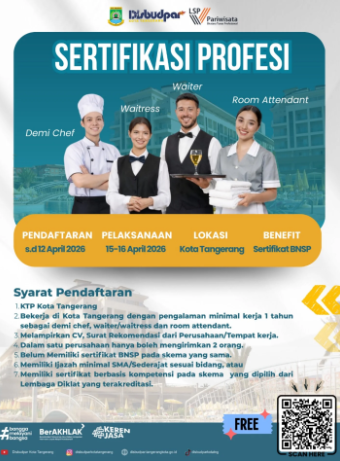 21 Apr 2026 11:09 Hari Pertama Sertifikasi Kompetensi SDM Pariwisata Kota Tangerang Berlangsung Lancar dan Penuh Antusias Read More 20 Apr 2026 11:13 Sertifikasi Profesi SDM Pariwisata Kota Tangerang Sukses Digelar, Dorong Tenaga Kerja Lebih Profesional dan Berdaya Saing Read More 19 Apr 2026 11:12 Akhir Pekan Seru di Kota Tangerang, Car Free Day Jadi Ruang Sehat dan Kebersamaan Read More 13 Apr 2026 11:07 Kunjungan Kerja Spesifik Komisi VII DPR RI Dorong Penguatan Pariwisata Kota Tangerang Read More 10 Apr 2026 11:05 Kesempatan Emas! Disbudpar Kota Tangerang Buka Pelatihan & Sertifikasi Lifeguard Profesional Read More 08 Apr 2026 11:03 Disbudpar Kota Tangerang Raih Penghargaan Kualitas Renja 2026 Terbaik di Musrenbang Read More 07 Apr 2026 11:02 Audisi Gita Bahana Nusantara 2026 Segera Digelar, Wadah Generasi Muda Tunjukkan Bakat Terbaik Read More 02 Apr 2026 16:12 Disbudpar Kota Tangerang Gelar Sertifikasi Profesi Pariwisata Gratis Read More 31 Mar 2026 11:00 Disbudpar Kota Tangerang Buka Sertifikasi Profesi Pariwisata Gratis, Tingkatkan Daya Saing SDM Read More 31 Mar 2026 10:58 Apel Pagi dan Halal Bi Halal Disbudpar Kota Tangerang, Perkuat Kebersamaan dan Komitmen Pelayanan Read More 15 Mar 2026 10:57 Jelang Idulfitri, Beragam Pusat Belanja di Kota Tangerang Siap Penuhi Kebutuhan Lebaran Read More 10 Mar 2026 10:55 Perkuat Ekosistem Ekraf, Pelaku Kreatif Kota Tangerang Ikuti Rakor di Provinsi Banten Read More 28 Feb 2026 10:51 JakCloth Lebaran Fair 2026 Resmi Dibuka, HUT ke-33 Kota Tangerang Makin Meriah Read More 24 Feb 2026 10:50 Culinary Day 2026 Hadir di Kota Tangerang, Semarakkan HUT ke-33 dengan Ngabuburit Penuh Kebersamaan Read More 18 Feb 2026 10:48 Wisata Kano Tetap Beroperasi Selama Ramadhan, Hadirkan Ngabuburit Sehat dan Seru di Kota Tangerang Read More 14 Feb 2026 10:45 Ide Kreatif: Ketapel Tradisional Naik Kelas, Jadi Produk Bernilai Jutaan Rupiah Read More 14 Feb 2026 10:43 Event Clothing & Hiburan Terbesar Meriahkan HUT ke-33 Kota Tangerang di Metropolis Town Square Read More 13 Feb 2026 10:53 Tangerang Ngebesan 2026, Harmoni Budaya dalam Semarak HUT Kota Tangerang Read More 13 Feb 2026 10:42 Semangat Gotong Royong Warnai Aksi Bersih-Bersih di Kawasan TMP Taruna Kota Tangerang Read More 11 Feb 2026 10:50 Tangerang Ngebesan 2026, Wujud Nyata Pelayanan Publik dalam Rangka HUT ke-33 Kota Tangerang Read More 31 Jan 2026 10:47 UMKM Kota Tangerang Tampil di INACRAFT 2026, Bawa Karya Lokal ke Panggung Internasional Read More 29 Jan 2026 10:46 Tangerang Bersholawat 2026, Semarakkan HUT ke-33 dengan Nuansa Religi dan Kebersamaan Read More 29 Jan 2026 10:42 RAKERDA BPD PHRI Provinsi Banten di Novotel Tangerang, Perkuat Sinergi Industri Pariwisata dan Ekonomi Kreatif Read More 28 Jan 2026 10:41 Festival Cisadane 2026 Masuk KEN, Kota Tangerang Torehkan Prestasi di Tingkat Nasional Read More 25 Jan 2026 10:39 Mengenang Semangat Pengabdian, 25 Januari Diperingati sebagai Hari Bhakti Taruna Read More 23 Jan 2026 09:31 Layanan Pangkas dan Asuransi Pohon dialihkan ke Dinas Lingkungan Hidup Read More 21 Jan 2026 10:37 Penguatan Kolaborasi Antar Daerah, Disbudpar Kota Tangerang dan Disporapar Kota Sukabumi Dorong Ekonomi Kreatif Berkelanjutan Read More 20 Jan 2026 10:35 Mengintip Proses Produksi Pop Laksa Instan di Galeri Bintang Sawi: Cita Rasa Lokal dalam Kemasan Modern Read More 15 Jan 2026 12:16 INILAH LOGO RESMI HUT KE-33 KOTA TANGERANG! Read More 15 Jan 2026 10:28 Bidang Pertamanan Disbudpar Kota Tangerang Dukung Penertiban Kawasan dalam Apel Penertiban Pasar Anyar Read More 14 Jan 2026 10:31 Resmi Diluncurkan, Ini Logo HUT ke-33 Kota Tangerang: Semangat Melayani Tiada Henti Read More 06 Jan 2026 08:34 Pegawai Disbudpar Kota Tangerang Gelar Giat Bersih-Bersih di Kecamatan Neglasari Read More 12 Dec 2025 10:23 Disbudpar Kota Tangerang Promosikan Potensi Wisata dan Investasi di Indonesia Tourism & Trade Investment Expo 2025 Batam Read More 05 Dec 2025 15:23 Semarak Perlombaan Melukis Benteng Culture Festival: 27 Peserta dari Berbagai Daerah Meriahkan Ajang Kreativitas Read More 05 Dec 2025 14:20 LOMBA MELUKIS MERIAHKAN FESTIVAL BUDAYA KOTA TANGERANG 2025 Read More 03 Dec 2025 14:18 FESTIVAL BUDAYA KOTA TANGERANG 2025 SIAP HADIRKAN KEMERIAHAN SPEKTAKULER Read More 28 Nov 2025 14:16 HITUNG MUNDUR H-7 MENUJU BENTENG CULTURE FESTIVAL 2025! Read More 28 Nov 2025 08:37 Tangerang Great Sale 2025 Resmi Dibuka, Hadirkan Momentum Belanja Terbesar di Kota Tangerang Read More 27 Nov 2025 08:32 Disbudpar Kota Tangerang Perluas Jejaring dan Promosi Potensi Daerah di 14th Indonesia Tourism and Trade Investment Expo 2025 Read More 27 Nov 2025 08:29 Pelatihan Dasar Ansambel Gitar Akustik Digelar untuk Kembangkan Potensi Musisi Muda Read More 26 Nov 2025 08:27 Festival Budaya Kota Tangerang 2025 Hadir Lebih Meriah, Rayakan Kekayaan Seni dan Tradisi Lokal Read More 22 Nov 2025 11:40 Dari Ekspresi ke Emosi, Pelatihan Basic Acting Bersama Dinding Boneng Perdalam Seni Peran Read More 22 Nov 2025 08:21 Culinary Day 2025 Resmi Digelar, 1.000 Porsi Laksa Dibagikan Gratis di Kota Tangerang Read More 21 Nov 2025 11:38 Saatnya Level Up Profesi, Disbudpar Kota Tangerang Gelar Peningkatan Kompetensi SDM Pariwisata Read More 21 Nov 2025 11:37 Bincang Budaya “Seni Pertunjukan” Meriahkan Festival Budaya Kota Tangerang 2025 Read More 19 Nov 2025 11:35 Culinary Day 2025 Hadirkan Pesta Kuliner dan Hiburan di Alun-Alun Ahmad Yani Kota Tangerang Read More 17 Nov 2025 11:34 Closing Ceremony Cisadane Digital Fest 2025 Resmi Ditutup, Catat Antusiasme Tinggi dan Dampak Ekonomi Signifikan Read More 15 Nov 2025 11:31 Disbudpar Kota Tangerang Hadiri GOLOKDAY Festival 2025 di Alun-Alun Kota Cilegon Read More 13 Nov 2025 11:20 Opening Ceremony Cisadane Digifest 2025 Resmi Dibuka, Dorong Inovasi dan Kreativitas Digital Generasi Muda Read More 12 Nov 2025 11:18 Menteri Sosial RI Kunjungi Museum dan Taman Makam Pahlawan Taruna Kota Tangerang Read More 11 Nov 2025 11:16 Menuju Cisadane Digifest 2025, Wali Kota Tangerang Tinjau La